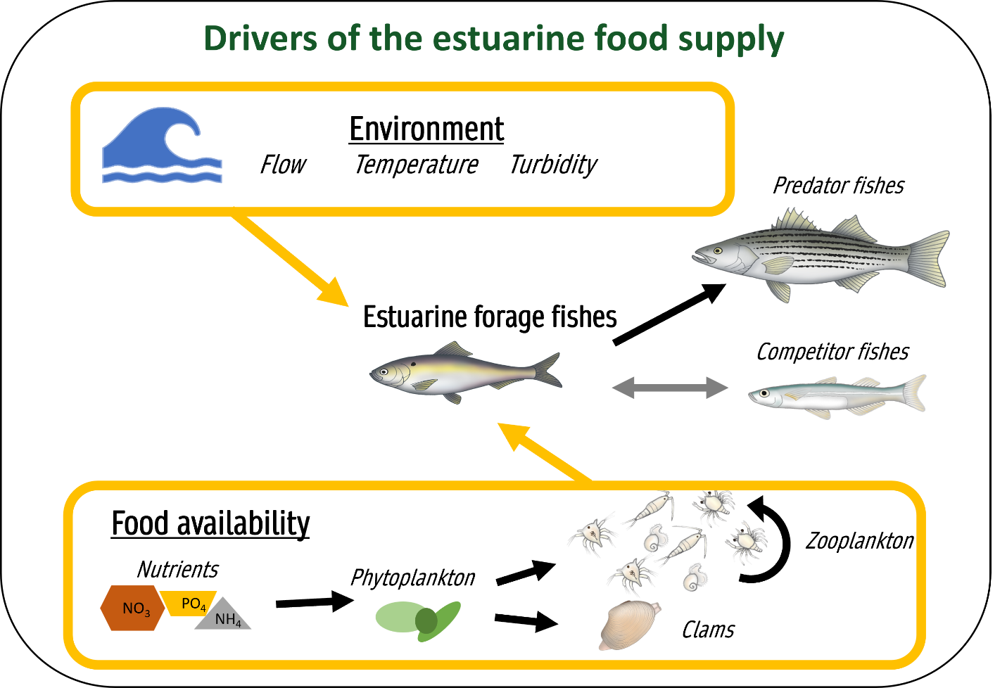 Figure adapted from: Rogers et al. 2024. Evaluating top-down, bottom-up, and environmental drivers of pelagic food web dynamics along an estuarine gradient. Ecology. https://doi.org/10.1002/ecy.4274