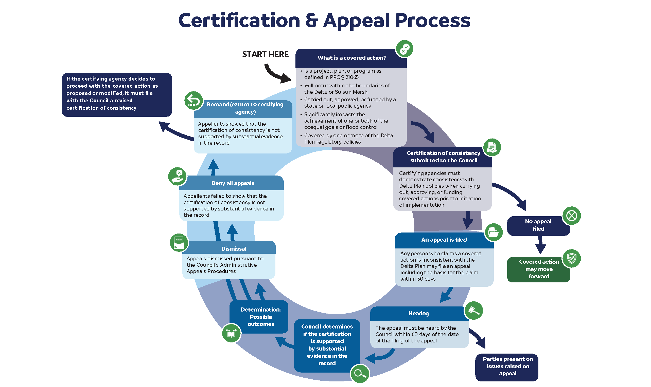 The chart below outlines the certification and appeal process associated with a covered action. This diagram is a reference tool only and should not be relied on when preparing a certification of consistency, an appeal, or as legal guidance regarding the Delta Plan or the appeal process. The Delta Plan regulatory policies are found in the California Code of Regulations, Title 23, section 5001, et seq. For ease of reference, view the policy text at deltacouncil.ca.gov/pdf/delta-plan/regulations/2023-04-05-delta-plan-policies-handout.pdf.